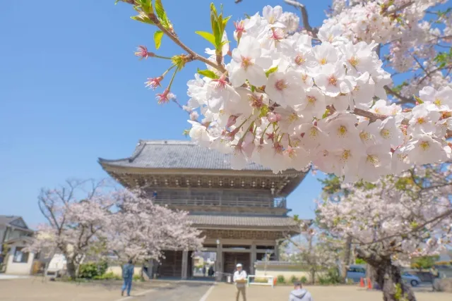 Komyoji Temple offers a rare combination of cherry blossoms, the Pacific Ocean, and Mt. Fuji. From the observation deck behind the temple, you can see all three in one panoramic view.
