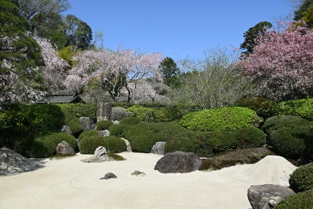 The weeping cherry trees near the main gate are particularly impressive. While the temple is extremely crowded in June, the spring season is relatively quiet. The pink blossoms against the traditional Zen garden offer a peaceful experience. Somei Yoshino trees also line the road leading from the station to the temple.