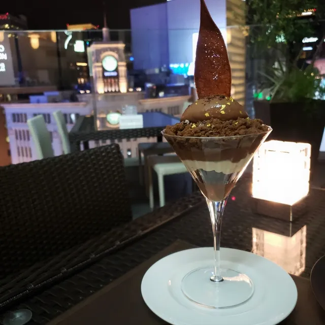 A rich but balanced layered parfait featuring praline gelato, 70% cacao gelato, pistachio pudding, and chiffon cake rusk.