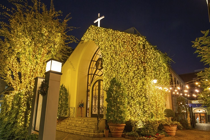 The beautiful standalone Minami-Aoyama L’Anges Church, located near Omotesando, glows with warm candlelight and elegant illumination—creating a peaceful and romantic Christmas atmosphere.