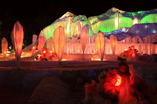 In February, Asahikawa transforms into a city of ice and light during the Asahikawa Winter Festival. Running since 1960, the festival is famous for its massive snow sculpture—one of the largest in the world, measuring roughly 140 m (460 ft) wide and 20 m (65 ft) tall.