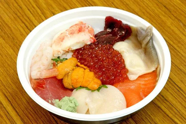 You buy a bowl of white rice and then walk around the market to different stalls, choosing fresh toppings like sea urchin, salmon roe, or local shrimp. It is a fun, interactive way to enjoy the freshest catch of the day at a reasonable price.