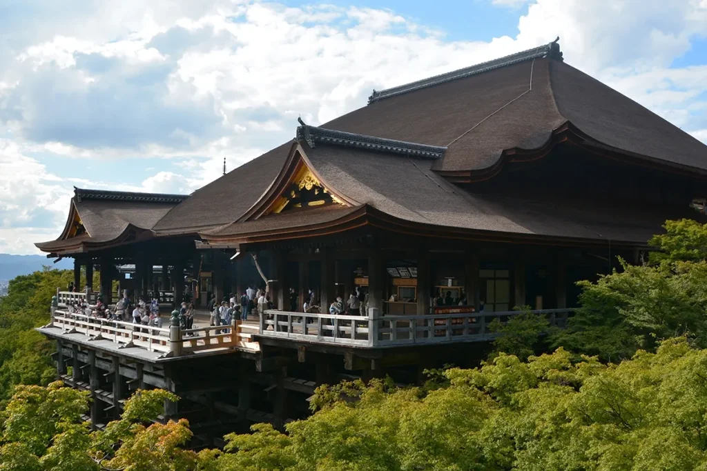 Kiyomizu-dera is famous for its large wooden stage built without nails, extending over a hillside. From the stage, visitors can enjoy panoramic views of Kyoto, which change beautifully with the seasons—cherry blossoms in spring, greenery in summer, autumn leaves, and occasional snow in winter.