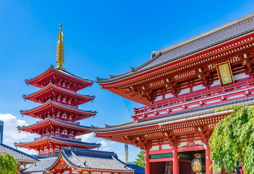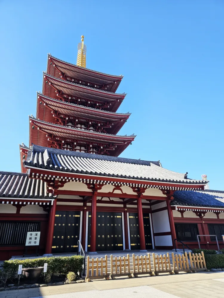 The Five-story Pagoda at Senso-ji stands out prominently within the temple grounds and represents traditional Japanese Buddhist architecture. It rises over 50 meters high and is visible from a distance.